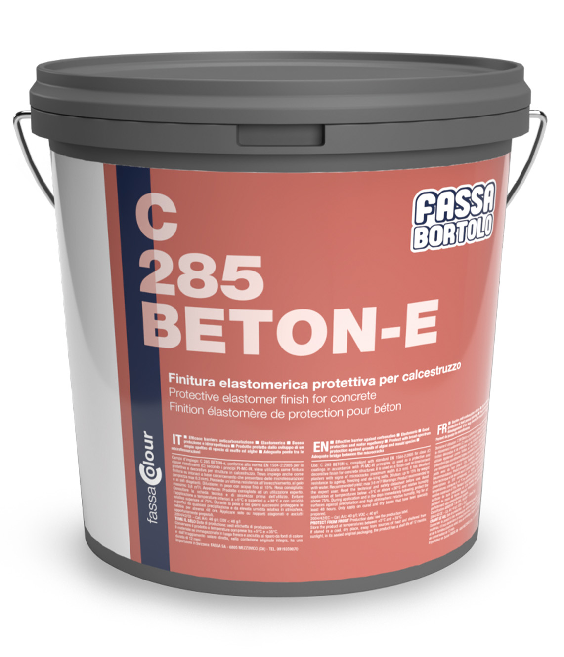 C 285 BETON-E est une peinture monocomposant à l’eau, qui filme en surface à la lumière naturelle, utilisée comme finition protectrice et décorative sur des structures en béton, en les protégeant de la carbonatation, ou comme finition sur des enduits à base de chaux/ciment présentant des microfissures (largeur maximale 0,3 mm). C 285 BETON-E après séchage, possède une résistance optimale au vieillissement, au gel et aux sels de dégel ; il est conforme à la norme EN 1504-2:2005 (systèmes de protection de surface pour le béton) pour le classement revêtements (C) selon les principes 1.3 (protection contre les risques de pénétration, PI) 2.2 (contrôle de l'humidité, MC), 8.2 (augmentation de la résistivité, IR) critère d'attestation en système 2+ , tableau ZA.2. Elle peut être utilisé sur système d’isolation thermique par l’extérieur suivant règles ETICS après étude préalable (entretien K1 et K2).