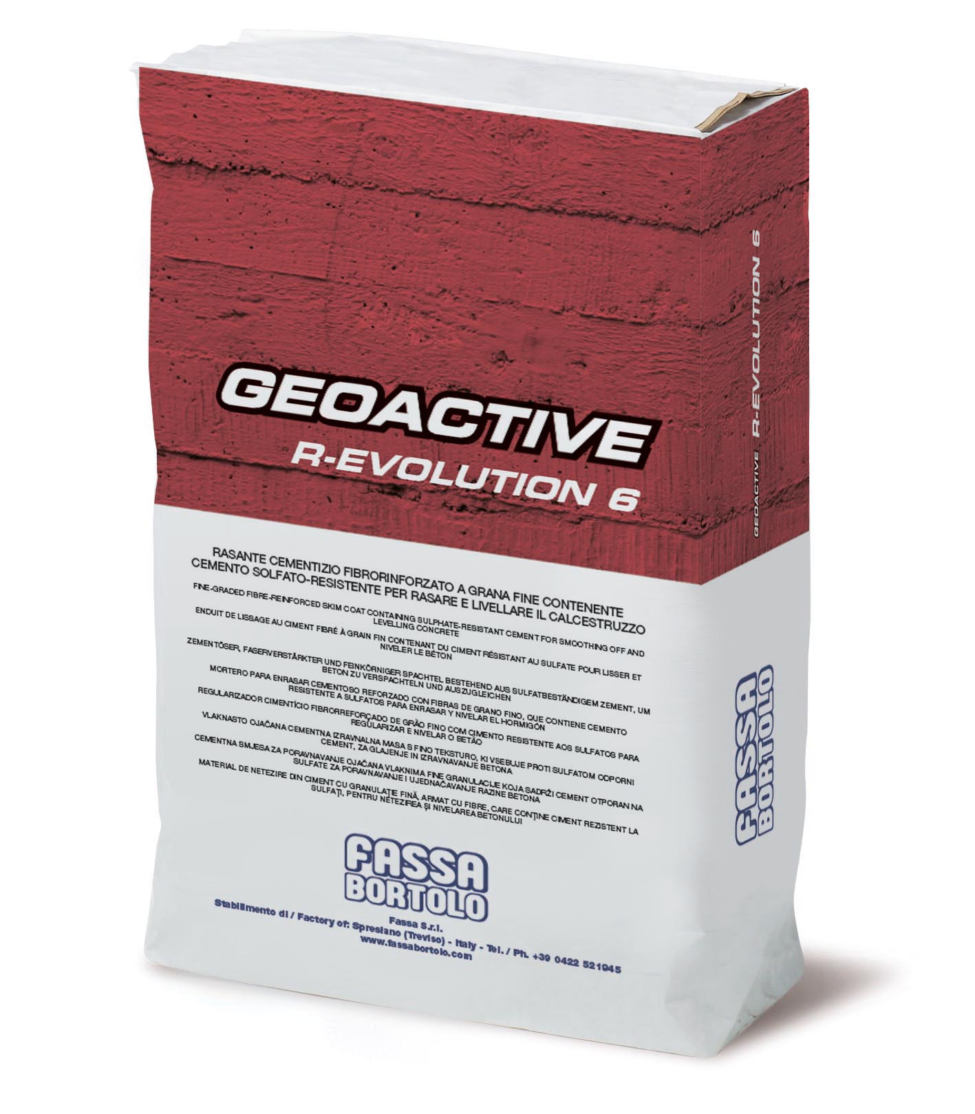 GEOACTIVE R-EVOLUTION 6 est un enduit de lissage minéral pour l'intérieur et l'extérieur, à haute stabilité dimensionnelle, aux caractéristiques mécaniques élevées, utilisé pour la rénovation et la régularisation du béton.